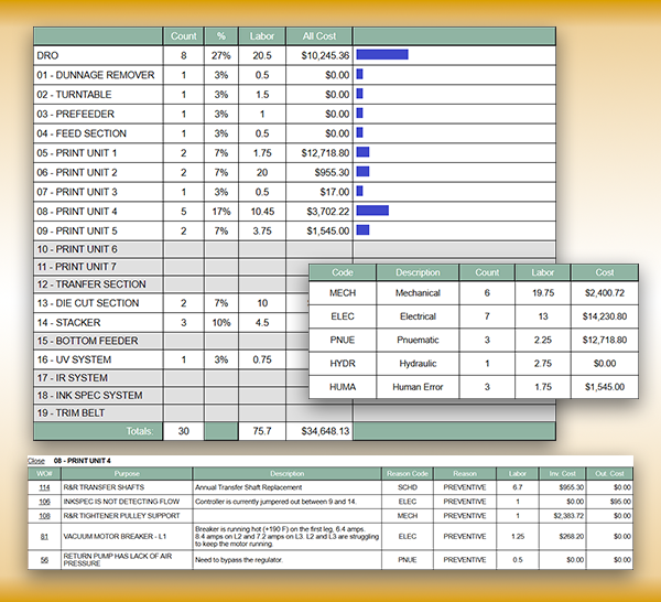 Our reports use straight up data and not flashy charts. These views allow you to select the rows and information to display the related information. Reports such as Work Order Activity, Asset Drilling, Monthly Completions, Base on Reason Codes, etc.